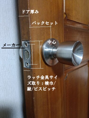 ご自身で室内/トイレ/浴室/クローゼットなどの円筒(握り玉)型/レバーハンドルタイプのドアノブ交換前に必ず行って欲しいことをアドバイスさせていただきます。まずは、①ドアノブの周囲にメーカー名:型式刻印表記があるか確認する。型式などの表記が無い場合、②ドアの厚みを測る。③バックセット:ドアの端からドアノブの中心まで測る。④フロント(ラッチ部材)ビス止め金具の縦長さ/横巾/ビスピッチを測る。その他、ドアノブ全体の取付け状態写真を撮る。以上4箇所の寸法取りが、ネット通販・ホームセンターなどでドアノブを購入する際に必要な情報です。これらの寸法と一致しない部品は形状が似ていても交換できませんので注意して、正確に測定してください。なお、交換方法は各メーカーの取扱い説明書を参考にしてください。